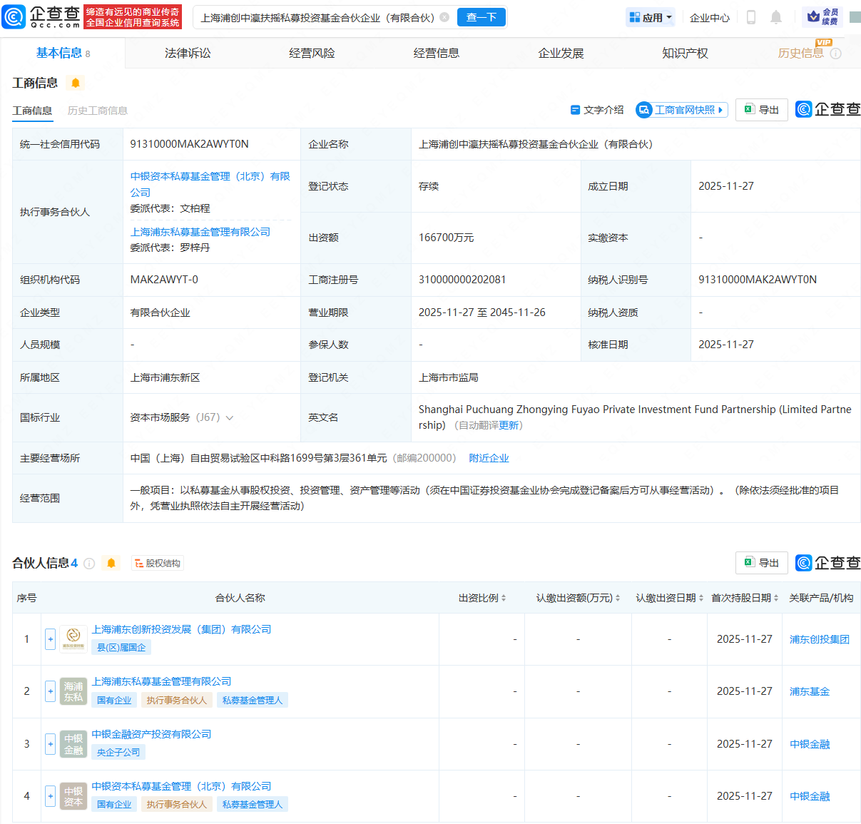近日,上海浦创中瀛扶摇私募投资基金合伙企业(有限合伙)成立,出资额16.67亿元,经营范围包含:以私募基金从事股权投资、投资管理、资产管理等活动。企查查股权穿透显示,该合伙企业由上海浦东创新投资发展(集团)有限公司、中银金融资产投资有限公司等共同持股。