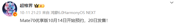 【CNMO科技消息】近日,有数码博主爆料称点石策略,华为Mate 70优享版将在10月14日开启预约,并于10月20日正式开售。