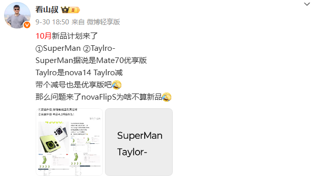除了华为Mate 70优享版的消息外点石策略,另有数码博主曝光了华为10月的新品计划。根据爆料,华为计划在本月推出两款新品,其内部代号分别为“SuperMan”和“Taylro-”。该博主推测,这两款产品其中一款就是华为Mate 70优享版,另一款则是nova14优享版。此外,还有爆料称华为有一款小折叠屏新机——nova Flip S即将发布。